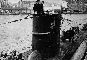L’U47 dans le port de Kiel le 24 octobre 1939 10 jours après le raid sur scapa flow. Le Korvetten Kapitän Prien se tient en haut de la baignoire sur la gauche. |