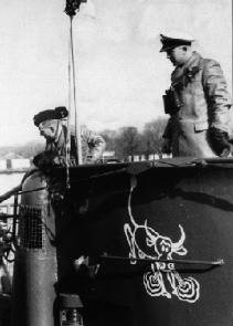 Günther Prien et le fameux insigne du Taureau apposé sur son U-boot. |