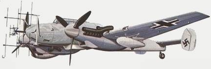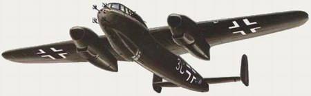 de chasse de nuit. En 1942, le manque de chasseurs de nuit provoqua la conversion de bombardiers classiques Do-217. 364 bombardiers Do-217 E-2 et Do-217 M furent ainsi modifiés en chasseurs de nuit Do-217 J et Do-217 N respectivement. Le Do-217 N-1 (notre document) était pourvu de 2 moteurs Daimler-Benz de 1 750 CV. Vitesse maximum : 515 km/h. Autonomie maximum : 2 500 km. Armement : 4 canons de 20 et 4 mitrailleuses de 7,9 vers l'avant. 1 mitrailleuse de 13 de défense supérieure. 1 mitrailleuse de 13 de défense inférieure. Radar FuG 202 Liechtenstein. |