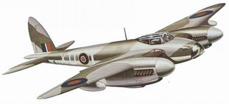 Ce bimoteur britannique fut utilisé par la R.A.F. pour la chasse de jour et de nuit, le bombardement, la reconnaissance, et 7 781 exemplaires en furent construits, en d'innombrables versions, telles que le B. Mk. /V (ci-dessous) avec 2 moteurs de 1 250 CV. Vitesse max. : 610 km/h. 900 kg de bombes. Pas d'armement; ou le F.B. Mk. XVIII (ci-contre) avec 2 moteurs de 1 635 CV. Armement : 1 canon Molins de 57; 4 mitrailleuses de 7.7; 2 bombes de 227 kg ou huit roquettes |