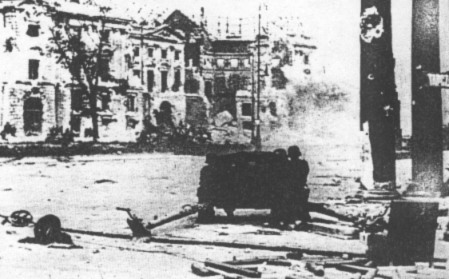 Un canon de 75 mm en action dans les rues de Varsovie en 1944 lors de l'insurrection. |