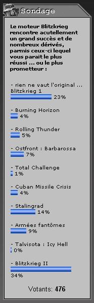 "Ce sondage sur Blitzkrieg et ses extensions a surtout montré que vous étiez pour la majorité (presque 60 %) plus attaché au jeu de base ou plein d'espoir dans le deuxième opus à paraître. Et pour ceux curieux d'extensions, leur favori est Stalingrad (14 %). Notons au passage l'excellent succès d'estime du mod francophone en développement Armée Fantômes, qui obtient un honorable 9 %." | Le jeu le plus attendu automne 2004