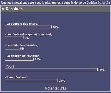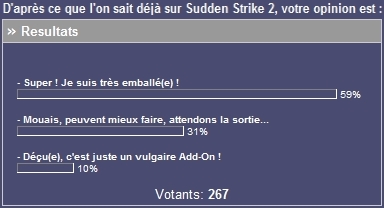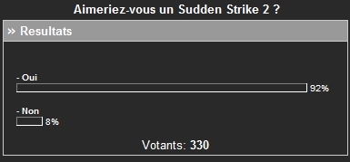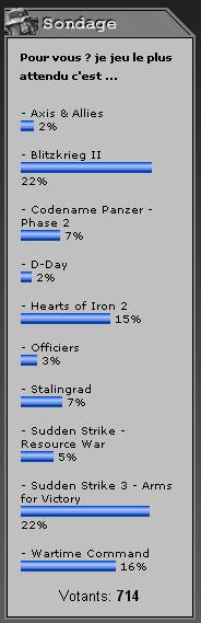 "Mais revenons rapidement sur le dernier sondage, déjà pour relever la participation record : vous avez été plus de 700 à y répondre et nous vous en remercions. Mais aussi pour remarquer que c'est Blitzkrieg 2 et Sudden Strike 3 (pratiquement à égalité parfaite) qui sont les jeux les plus attendus par la majorité d'entre vous, viennent ensuite dans un mouchoir de poche Wartime Command (Theatre of War) et Hearts of Iron 2 aux environs des 15 % chacun." |