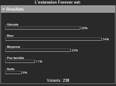 Forever semble s'être imposé dans les esprits et dispose d'une confortable avance. A noter le score remarquable de l'intemporel Empire Earth, qui de la préhistoire au futur, passe immanquablement par l'âge de la Seconde Guerre Mondiale, eh oui lui aussi :-) Le site établi ici un record de participation, après un peu plus d'un an et demi d'existence seulement. |