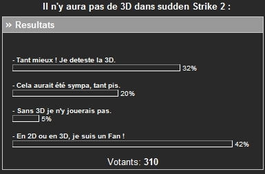 Rétrospectivement intéressant à analyser : en dehors des fans absolus imperméables aux graphismes à venir, qu'ils soient 2D ou 3D (42 % tout de même !), on constate qu'en seconde position 32 % des joueurs ont horreur du grand méchant polygone. Seule une extrême minorité (5 %) semble s'y attacher ferme. Voila qui montre que les attentes n'étaient certainement pas dans la lignée de ce qui se fit plus tard... | Sudden Strike 2 : oui ou non ? automne 2001