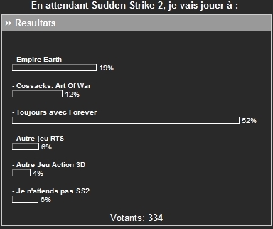 Confirmation ici de la grande espérance suscitée par Sudden Strike 2, confortée jusque là par les informations ayant filtré à son sujet. On constate cependant une inquiétude quant au produit fini, qui finira par se matérialiser à la sortie du jeu... avec une éclosion sans précédent de mods ayant pour but de "terminer un Sudden Strike 2 bâclé", comme la nouvelle version du RWM ou bien encore le fameux SSNM. Ceci divisera d'autant plus la communauté entre Foreveriens, fans de SS2, et joueurs voguant de mods en mods. | Votre jeu du moment printemps 2002