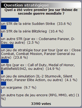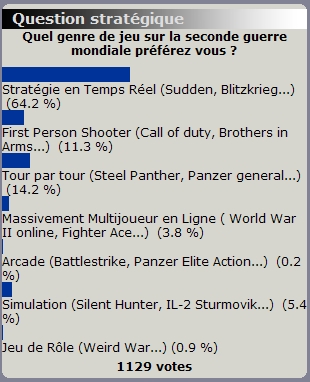 "On constate [...] votre nette préference pour les jeux de stratégie en temps réel (64,2 % !), qui est par ailleurs le genre maintenant dominant dans la période 39-45, avec tout-de-même les FPS, qui ici pointent en troisième position seulement (11,3 %) ! En effet, le "vieux" tour par tour des Steel Panther, Panzer General et autres légendes du jeu vidéo vole le titre honorable de seconde place, avec près de 15 % des suffrages. Preuve que le genre est encore présent dans de nombreux esprits férus de tactique. A noter la faible performance des simulations dont le grand sérieux et l'implacable réalisme semble vous rebuter. Quant aux autres genres, peu adaptés à la période, vous les reléguez (à juste titre ?) aux oubliettes, avec des scores dérisoires (moins de 5 % tout cumulé). Le chiffre des participations est ici peu parlant, étant donnée la durée d'affichage exceptionnelle de ce sondage." |