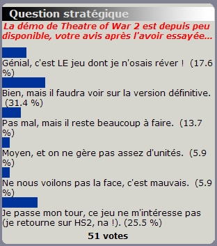 "Le premier chiffre frappant est la grande proportion d'entre vous que Theatre of War 2 laisse de marbre (25,5 %). Un désintérêt que vient confirmer la faible participation à cette enquête. TOW 2 serait-il une niche pour joueurs pointilleux ? Le jeu dégage une apparence de complexité qui semble rebuter le commun des mortels. Ce serait là fort dommage, le titre possédant un énorme potentiel, et étant notamment très fun en multijoueurs ! Toutefois, la démo jouable de ce second volet a bel et bien convaincu ceux qui se sont laissés tenter ! En effet, près de la moitié (49 %) des joueurs 39-45 qui se sont exprimés ont été vivement intéréssés et ont émis un avis très positif sur le jeu. En comparaison seule une petite minorité (11,8 %) n'a pas appréciée l'orientation du titre, un des reproches récurrents, déjà depuis le premier opus, étant le faible nombre d'unités gérées. Malgré tout et au final, nous sommes ici en présence ici d'un titre qui dans sa version de démonstration à déjà su fédérer une grande proportion des joueurs ayant fait l'effort de s'y intéresser." |