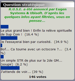 "L'E3 et le Festival du Jeu Vidéo, deux évènements où l'attention s'est portée le futur titre d'Ubisoft, j'ai nommé R.U.S.E. ! Ce qui fait que bien évidemment, la participation est en légère hausse [...] : regain d'intérêt donc, non seulement de par le nombre de votants, mais aussi par le fait qu'une grande proportion (74 %) se déclare plutôt curieuse, ou tout du moins attentiste (et donc peut-être ouverte à un essai du jeu). "Nomdédiou, vite une démo !" semblent clamer les joueurs. Patience, ca va venir... [...] On signale la présence probable de Sup-Com fanboys (16,4 %), qu'on salue au passage ^^ A remarquer également le taux extrêmement bas de déçus (9,6 %)..." | Démo de Theatre of War 2 de mars à avril 2009  Analyse parue dans la dépêche du 25/04/2009 :