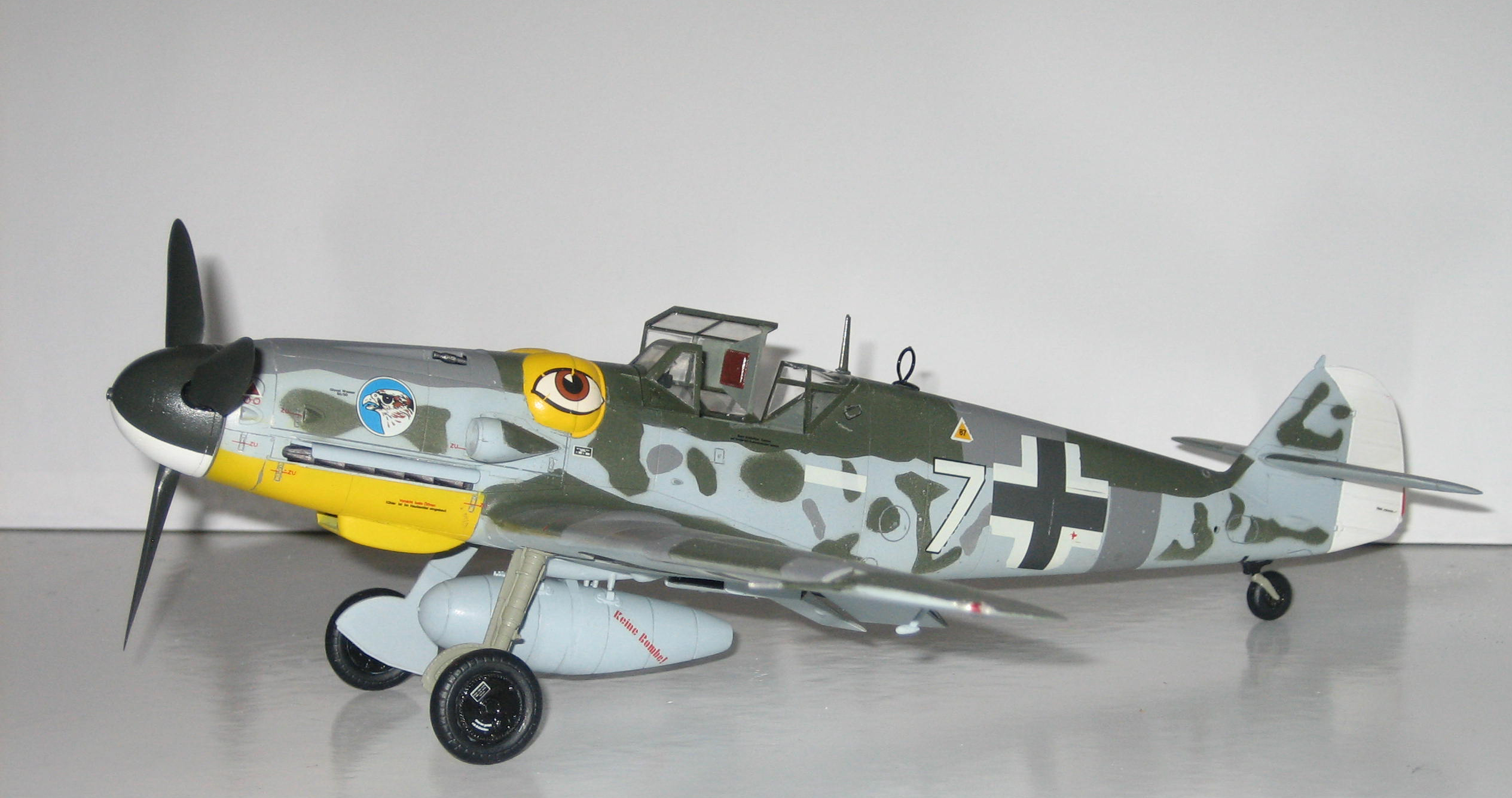 Et voici la maquette du 109 G6 réalisée par notre forumeur Targi ! Remarquez le réservoir supplémentaire sous l'appareil. "Keine Bombe !".