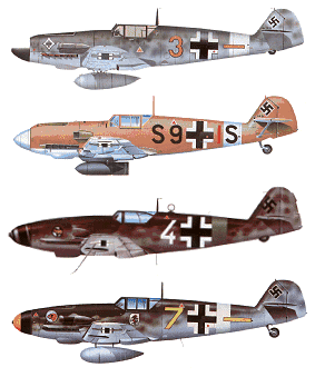 Du haut vers le bas : Me 109 F-4 / Me 109 E-4 / Me 109 K-4 / Me 109 G-2