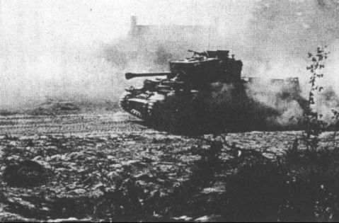 Un Cromwell fonce à travers un village de Normandie, il est équipé d'un canon de 75mm pour faire face au panzers |