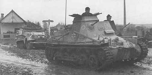 Puis l’arrivée d’Hitler au pouvoir en 1933 permet au développement de l’armée blindée de se faire ouvertement car le Chancelier allemand rejette le Diktat le 17 avril 1934 ; le Panzerkampf-Wagen I prend son appellation officielle. Le Panzer I fut commandé en 1932 et était destiné à l’entraînement des troupes blindées. Mais les programmes de conception et de production des chars moyens (les futurs PzKpfw III et PzKpfw IV) ayant pris du retard, le Panzer I fut affecté en première ligne. A la veille de la guerre, le Panzer I représente plus d’un tiers de l’arme blindée allemande. |