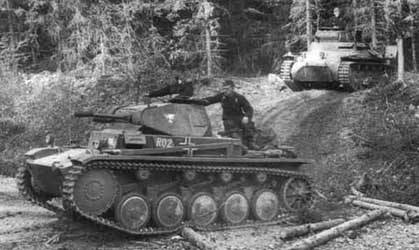 Avec les Panzer II Ausf c/A/B/C commence la production en série du Panzer II (les Panzer Ausf a1/a2/a3/b étant des modèles de pré-production et étant fabriqués en faible nombre). Ces quatre versions furent fabriqués à 1113 exemplaires entre mars 1937 et avril 1940 par MAN, Daimler-Benz, Henschel, Wegmann, Alkett, MIAG et FAMO. Les Panzer II Ausf D/E qui sont des modèles spécialement conçus pour la reconnaissance sont fabriqués à 43 exemplaires seulement entre mai 1938 et août 1939 par MAN et combattront pour les leichte Divisions de Cavalerie lors de la campagne de Pologne en 1939. Le Panzer II Ausf F qui est une version amélioré du Panzer II Ausf C est produit à 524 exemplaires entre mars 1941 et décembre 1942 par FAMO. Le Panzer II est spécialement étudiée pour la reconnaissance. Il reçoit un canon amélioré et son blindage est renforcé. Alors que la production de Panzer II avait diminué en 1940, elle reprend en 1941 avec ce modèle. La plupart des Panzer II quittèrent le service en première ligne en 1942. Certains restèrent pourtant en service beaucoup plus tard, puisqu'ils combattirent en Normandie et 145 étaient en service dans la Wehrmacht en mars 1945... |