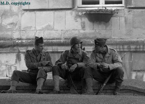 Le matin, le lieutnant nous a tous réunis en formation dans la cour de la ferme pour brieffieng des activités du jour. Le probléme était le retour du GMC. Le lendemain c'était le 6 juin donc le jour le plus important du séjour. Une marche de nuit de 25 Km ou un "voyage" en GMC jusqu'à Omaha Beach était au choix. Les intérréssés choisirent ce qui leur plaisiat le plus, je choisis le convoyage en GMC car 25 Km dans des brodequins à peine faits c'était perdu d'avance. Aprés une sénace de photos et les questions, nous sommes allés manger.