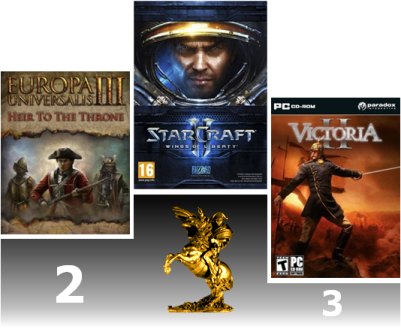 Il est temps de nous intéresser au "Meilleur Jeu de l'Année 2010". Comme pour la Catégorie "Meilleur Jeu de Stratégie en Temps Réel", Starcraft 2 a très largement dominé cette section. Au point que les autres jeux ont du se partager quelques miettes. Et à ce jeu du partage, ce sont les jeux Paradox qui s'en sortent le mieux en s'accaparant la deuxième (Europa Universalis 3 : Heir to The Throne) et la troisième place (Victoria 2). Ils peuvent dire merci à la communauté Strategium qui aura été très présente tout au long du concours. Derrière, viennent les gros blockbusters, tels RUSE, Napoléon : Total War ou encore Civilization V, puis les jeux plus modestes (Achtung Panzers, Hegemony, etc).