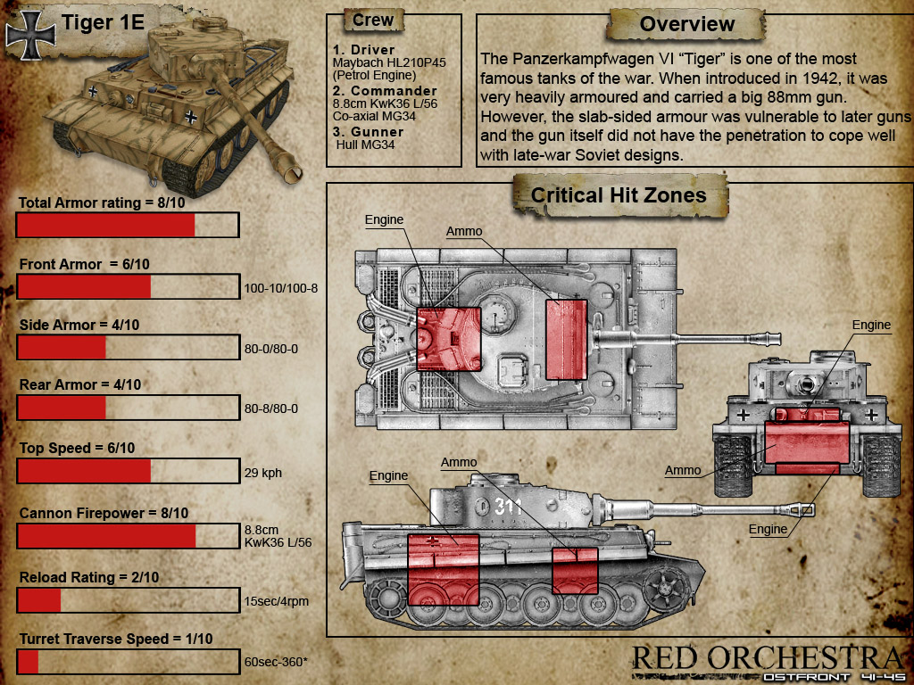 Le site officiel de Red Orchestra Osfront 41-45, vient de mettre à disposition des joueurs, 8 images affichant les caractéristiques de certains blindés (KV-1S, IS2, Panther G, Tiger 1E,etc...), telles l'épaisseur du blindage, la vitesse, le temps de rechargement etc... ainsi que les points faibles du char, renseignements ô combien précieux pour les joueurs lors des combats à venir.