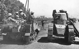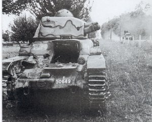 Un cliché "banal"d'un char R-35 français abandonné apres une escarmouche , en arriere plan l'ont vois un panzer III sur la route |