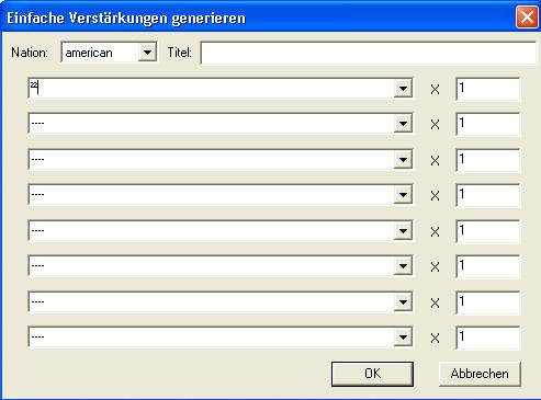 Une nouveauté dans la création des renforts, on peut maintenant générer des renforts « type » qui sont prédéfinis, avec 8 types de groupes possibles à ajouter par renfort et selon la nation. Autrement dit, il y aura certainement un gain de temps non négligeable, cette partie de création était aussi très longue sur l’éditeur Forever.