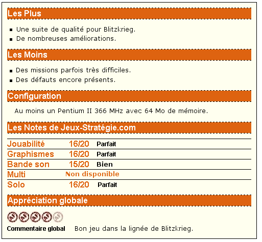 Une valeur sûre qui aurait pu corriger quelques défauts mineurs de Blitzkrieg (mais parfois énervants). Attention cependant à la difficulté de certaines cartes qui vous obligera à sauvegarder fréquemment.