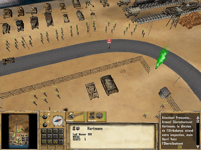 Maintenant que nous avons passé en revue toutes ces unités, examinons le "Gameplay". Les joueurs de Sudden Strike et d'autres RTS classiques ne seront pas perdus. Une mini-carte, un tableau de commande formé d'icônes simples à repérer. Un rectangle de sélection très visible permet de sélectionner plusieurs unités à la fois, il est possible de former des groupes (Ctrl+1, etc…) et les raccourcis-clavier sont entièrement paramétrables. Il est par ailleurs possible de mettre le jeu en pause pour donner plusieurs ordres à la fois à la même unité, afin qu'elle réalise plusieurs actions en une seule commande.